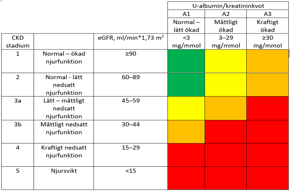 Tabell 1. Stadieindelning av kronisk njursjukdom (CKD). Färgerna indikerar riskökning för komplikationer (progress till njursvikt, kardiovaskulära händelser och mortalitet). (Låg risk – grön, måttlig risk – gul, hög risk – orange, mycket hög risk – röd.