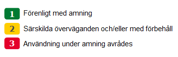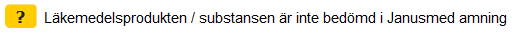 Läkemedelssubstanserna i kunskapsstödet Janusmed amning är bedömda utifrån en tregradig skala 1, 2 och 3 med färgmarkering grön, gul och röd. En gul ikon med frågetecken innebär att substansen/läkemedlet inte är bedömd i Janusmed amning.