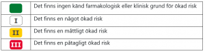 När skärmstorleken minskas visas matrisen i stående format. Det gäller t ex i en mobil eller på en PC när storleken på webbläsarfönstret minskas. För att se vilka läkemedel som bidrar till den ökade risken, klicka på pilen som visas till höger om de riskegenskaper som har ökad risk. Då kommer man till kortet där man både kan se vilket/vilka läkemedel som bidrar till den ökade risken, samt läsa konsekvens och rekommendation.