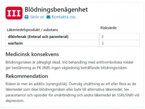 Användaren uppmärksammas på eventuella risker för några vanliga, eller potentiellt allvarliga, biverkningar på grund av att ett eller flera läkemedel påverkar samma riskegenskap (farmakodynamiska interaktioner). Information om farmakokinetiska interaktioner återfinns i Janusmed interaktioner. Kunskapsstöden används därför med fördel i kombination för att få en samlad bild av de interaktioner som ingår i Janusmeds kunskapsstöd.