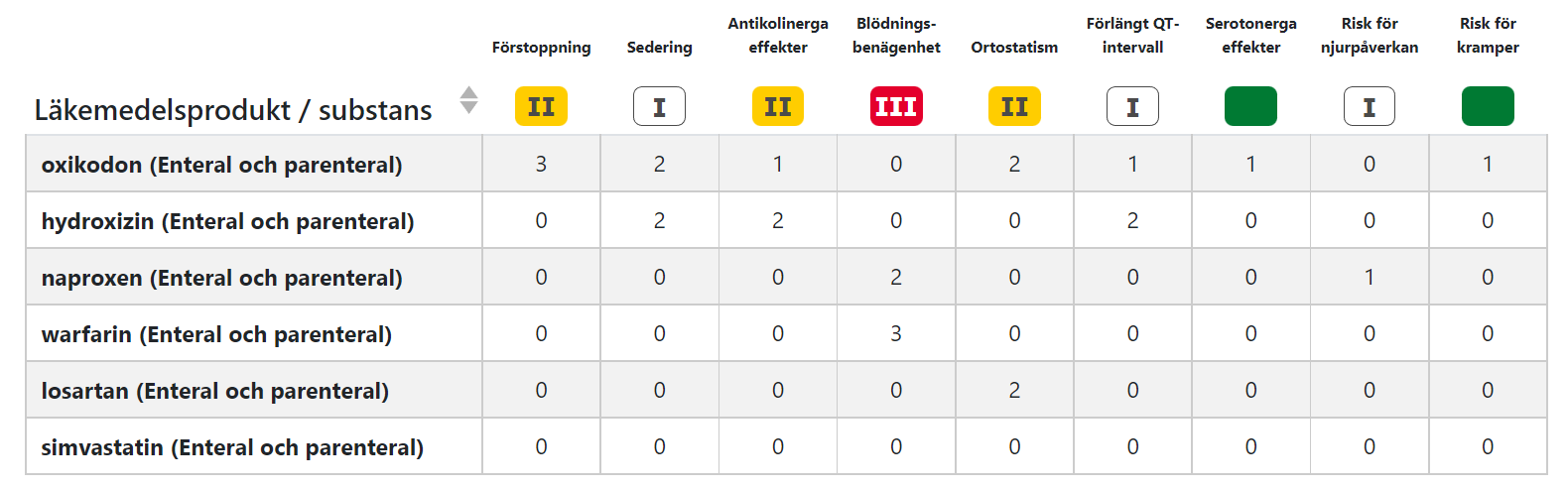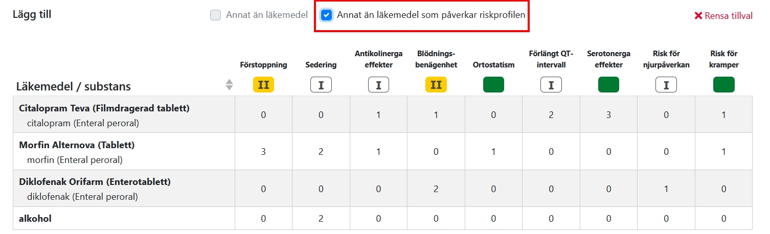 I Janusmed riskprofil baseras bedömningen alltid på de enskilda substansernas farmakologiska effekter. För läkemedelsprodukter som innehåller mer än en aktiv substans visas riskvärdena både för de ingående substanserna var sig, och summerade per produkt.